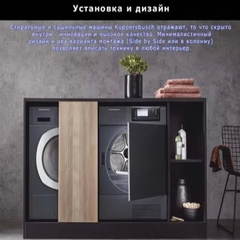 Сушильная машина Kuppersbusch T 40.0 R Ever RoseПрограммы/дополнительные программы: Автоматические программы для хлопка и немнущихся тканейОт степени сушки «под утюг» до «экстра-сухое»Специальные программыСушка в корзине, Удаление пыльцы, Смешанное, и другие программы: Рубашки, Джинсы, Синтетика, Шерсть, Спортивная одежда, Пух/ подушки, Махровые полотенца, Пропитка, Шелк, Освежить (10-90 минут), Отсрочка старта (10-150 минут)ИзбранноеСохраняет до 6 Ваших любимых программДополнительные функцииАнтибактериальная обработка, Бережный уход +, Сушка +, Отсрочка старта, Экспресс8 кг белья будут полностью высушены за 96 минут («в шкаф»)Преимущества:Большой цветной дисплей 4,3’’Корзина для сушки деликатных тканей и спортивной обувиСушильная машина конденсационного типа с технологией Heat Pump и система самоочистки Autoclean для эффективного использования электроэнергии на протяжении всего срока службы машиныВысший уровень эффективности конденсацииПрограмма антибактериальной обработки для гигиенической сушки бельяПрограмма «Удаление пыльцы» позволяет очистить ткани от пыльцыПревосходная шумоизоляция, макс. 61 дБ(А)Светодиодная подсветка барабанаЗащита от складокЭлектронная система измерения остаточной влажности бельяИндикация хода программы и времени до окончания программы, отложенный запуск – до 7 днейРегулируемый по интенсивности акустический сигнал окончания программыУгол открывания люка – 180°, диаметр люка – 36/31 смВозможность перенавески люка (правая/левая)Защита от детейКонтроль температурыСпециальные программыСушка в корзинеВлажные вещи из шерсти желательно как можно меньше подвергать воздействию, так как они имеют тенденцию сморщиваться и садиться. Спортивная обувь может повредить барабан из-за своего веса. Использование корзины позволяет выполнять деликатную сушку без перемещения отдельных стойких к машинной стирке предметов: шерстяные изделия, спортивную обувь из синтетических материалов или искусственной кожи, шапки, велосипедные шлемы, мягкие игрушки, игрушки и пр.СмешанноеЭта программа оптимально подходит для сушки смешанной партии белья из хлопка и синтетикиДругие программыИспользуйте эти программы для оптимальной сушки различных видов текстиля, например сорочек, блузок, джинсов, шерсти и пр.Дополнительные программыАнтибактериальная обработкаПри выборе этой программы увеличивается время дополнительной сушки, что позволяет уничтожать большинство бактерийБережный уход плюсДля бережной сушки деликатных вещей. Температура сушки пониженаОтсрочка стартаС помощью данной программы запуск программы можно отложить на более позднее время в соответствии со своим привычным образом жизни (например, для использования льготного ночного тарифа на электроэнергию)Сушка +При выборе этой программы временно увеличивается степень сушки — на время работы выбранной программыВремяПри открытии программы с управлением по времени отображается минимальное время выполнения программыЭкспрессДля быстрой сушки небольшой партии или отдельных изделий из хлопка, синтетики или смешанной тканиХарактеристики:Конденсационная сушильная машина с технологией Heat PumpЗагрузка 1-8 кгСтационарная установка/установка в колоннуНавеска люка левая/праваяВозможность изменения навески люкаРазмеры прибора (Ш х В х Г): 595 х 850 х 640 ммСделано в Швейц